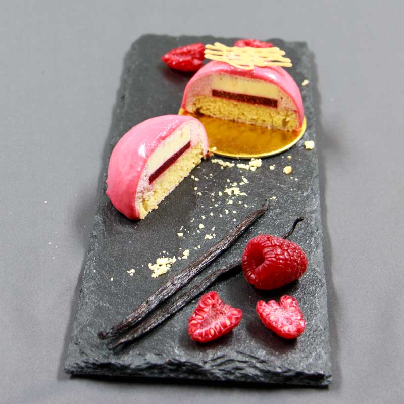 Produktbeschreibung: Luftig-lockere Himbeer-Mousse auf saftigem Butter-Biskuit, mit Himbeer-Glasur und Schokoladendekoration ("Einsteiger"-Variante); bei der "Kernkraft"-Variante zusätzlich ein Kern aus Panacotta und Himbeer-Gelee. Alles ohne künstliche Farbstoffe! Nur Farben der Natur!